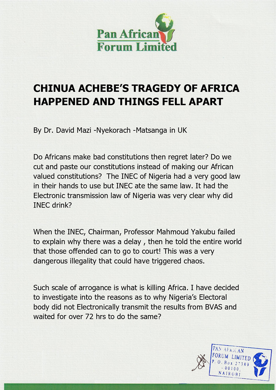 0303CHINUA ACHEBE’S TRAGEDY OF AFRICA HAPPENED AND THINGS FELL APART
