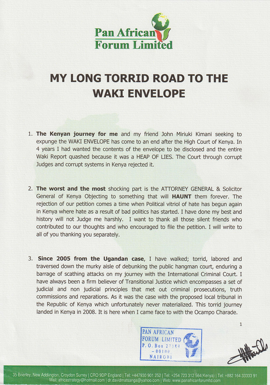 1207MY LONG TORRID ROAD TO THE WAKI ENVELOPE Tel: +447930901252 Tel: +254723312564 africastrategy@hotmail.com. dr.davidmatsanga@yahoo.com. www.panafricanforumltd.com. www.africaworldmedia.com www.africaforumonicc.com Follow Me On: Twitter: https://twitter.com/MatsangaDr Facebook: https://www.facebook.com/matsanga.david.1
