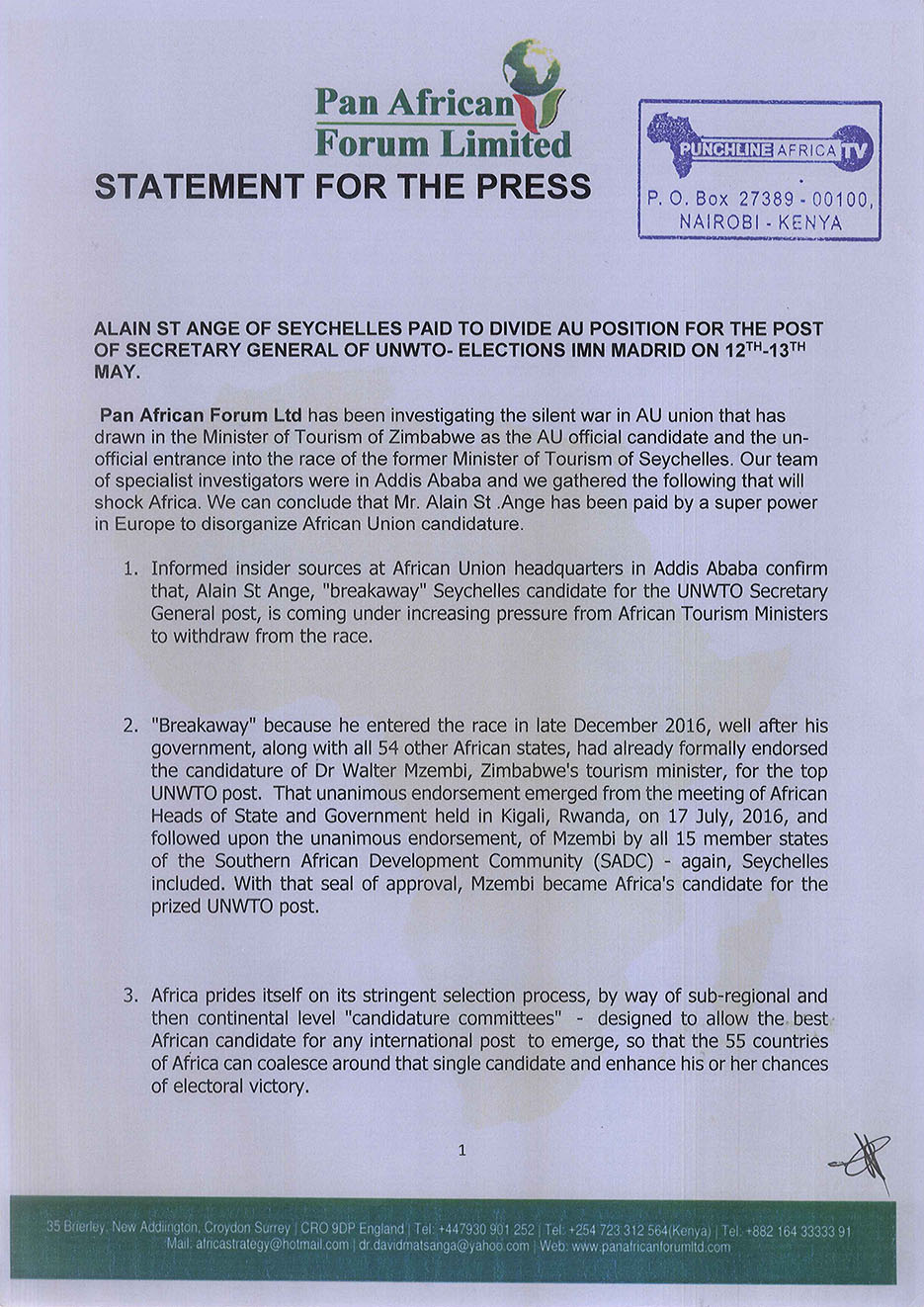 2601ALAIN ST ANGE OF SEYCHELLES PAID TO DIVIDE AU POSITION FOR THE POST OF SECRETARY GENERAL OF UNWTO
