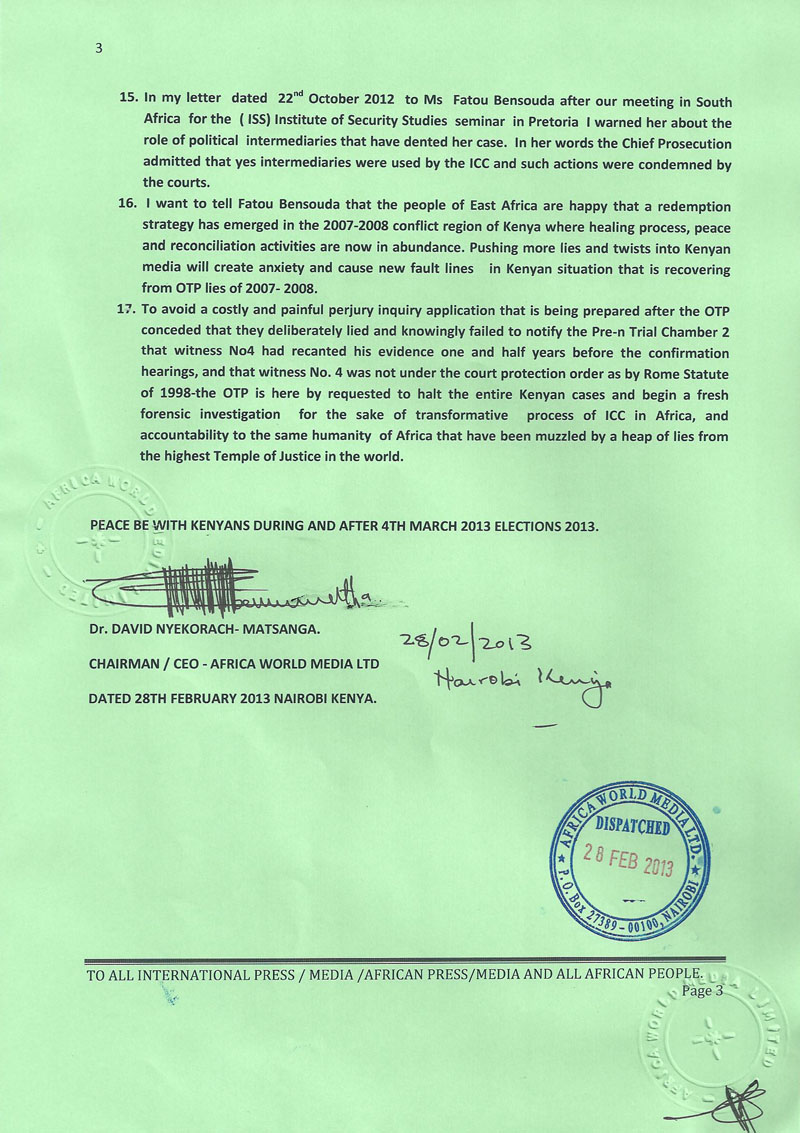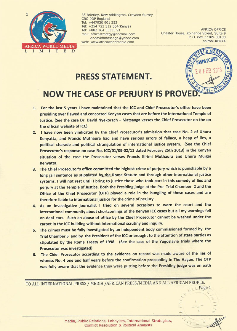 0103PRESS STATEMENT: NOW THE CASE OF PERJURY IS PROVED Dr. David Nyekorach – Matsanga. Chairman /CEO Pan African Forum Ltd & Africa world Media Ltd +44(0)7930901252 +254(0)723312564 Surrey England africastrategy@hotmail.com dr.davidmatsanga@yahoo.com